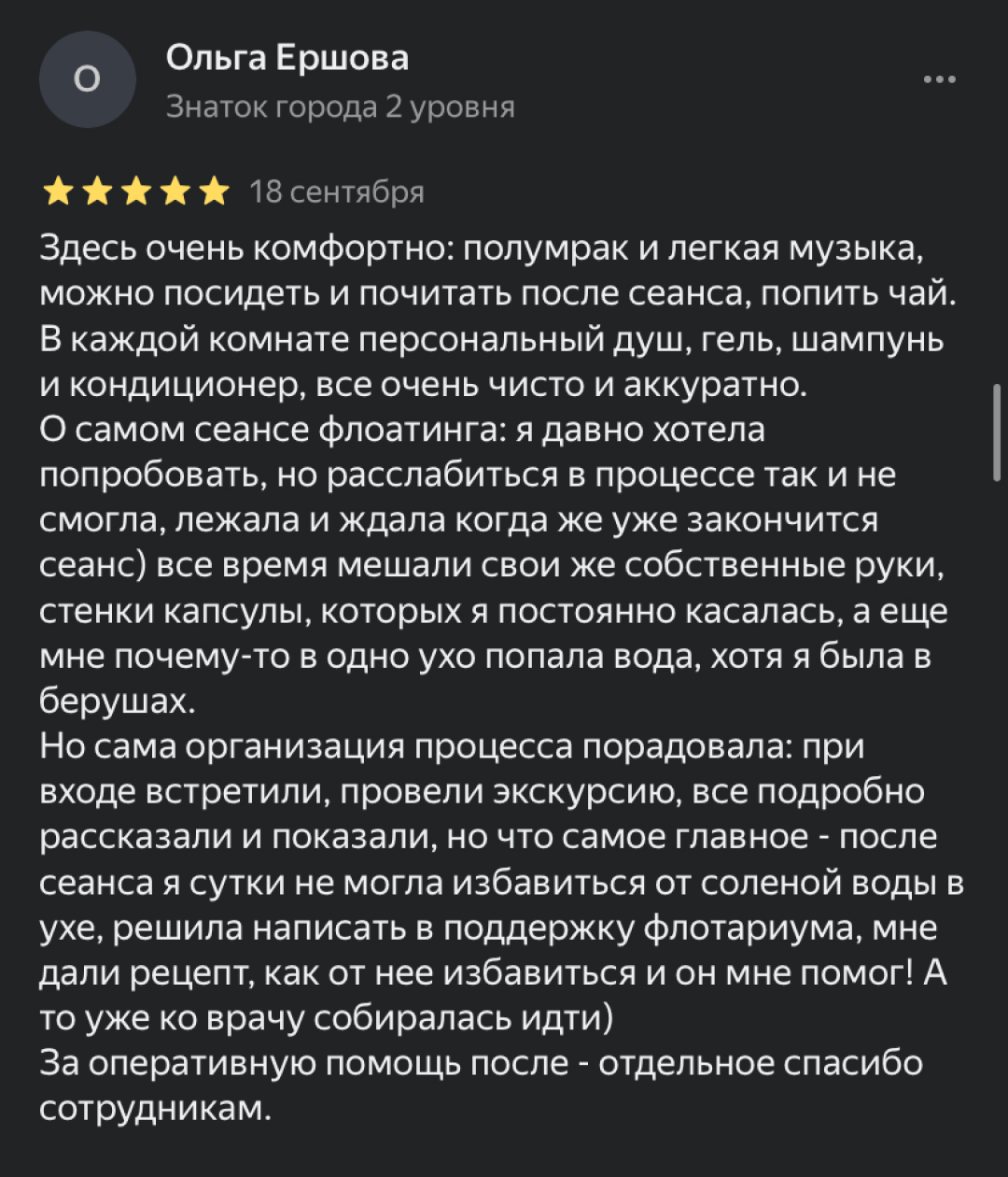 Cреда с нулевой гравитацией, которая позволяет телу и сознанию по‑настоящему глубоко отдохнуть. Используя 400 кг магниевой соли, мы создаём раствор высокой плотности, который позволяет в буквальном смысле парить в невесомости, не чувствуя тела.